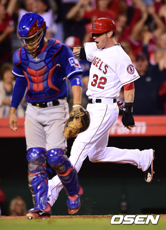 연장 10회말 무사 1루 에인절스 켄드릭의 안타로 해밀턴이 득점을 올리고 있다./youngrae@osen.co.kr