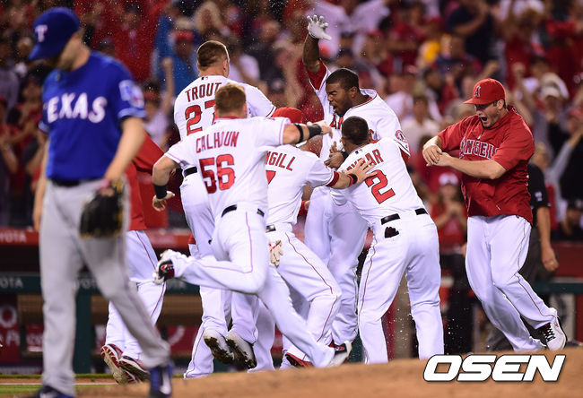 연장 10회말 무사 1루 끝내기 안타를 때린 에인절스 켄드릭이 동료들에게 축하받고 있다./youngrae@osen.co.kr