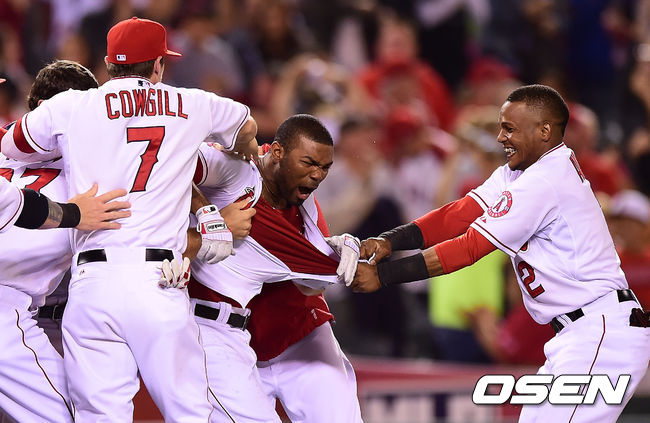 연장 10회말 무사 1루 끝내기 안타를 때린 에인절스 켄드릭이 동료들에게 축하받고 있다./youngrae@osen.co.kr