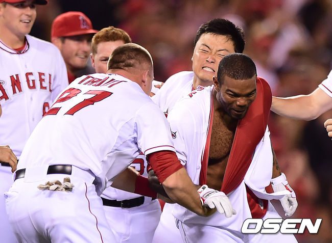 연장 10회말 무사 1루 끝내기 안타를 때린 에인절스 켄드릭이 트라웃과 최현에게 축하받고 있다./youngrae@osen.co.kr