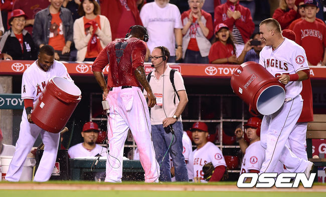 연장 10회말 무사 1루 끝내기 안타를 때린 에인절스 켄드릭이 동료들에게 축하받고 있다./youngrae@osen.co.kr