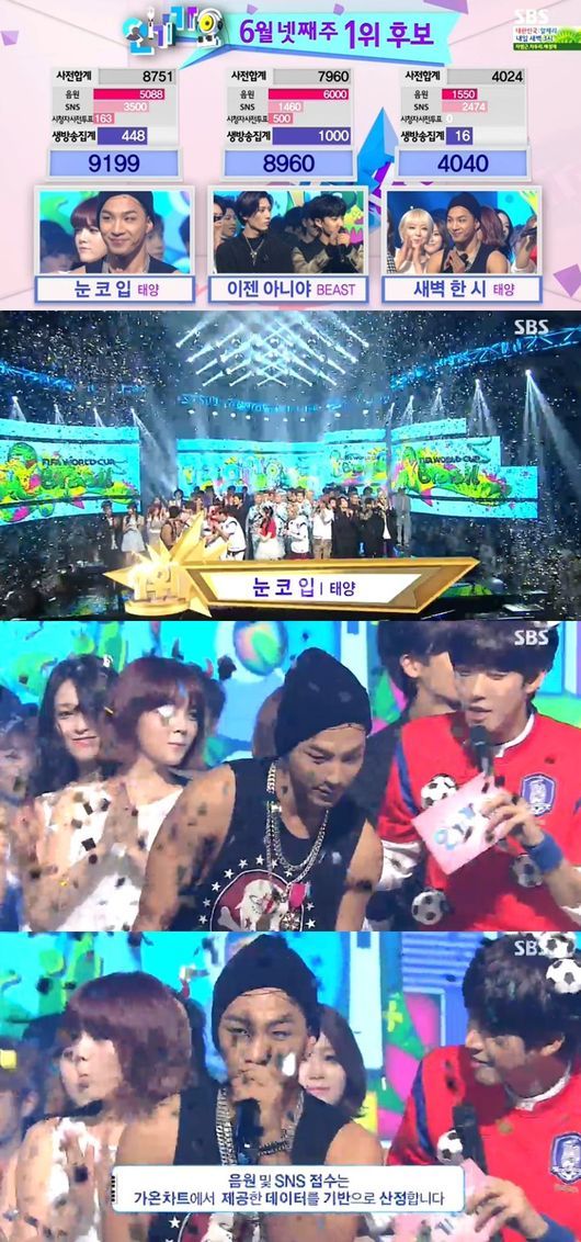 태양은 22일 방송된 SBS '인기가요'에서 '눈, 코, 입' '새벽 한 시' 2곡을 1위 후보에 올려 비스트의 선공개곡 '이젠 아니야'와 경합을 벌였고, 최종 투표결과 '눈, 코, 입'으로 또 하나의 1위 트로피를 거머쥐었다.