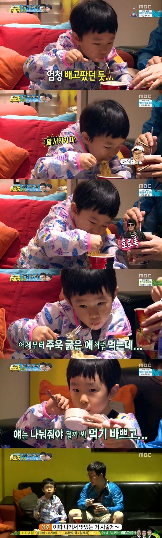 방송인 김성주의 아들 김민율이 눈치를 보며 초스피드 라면 '먹방'을 펼쳐 웃음을 줬다.