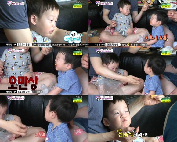 이에 서준은 귤을 달라고 이휘재에게 내밀었고, 이휘재는 귤 껍데기를 까서 서준의 입에 넣어줬다. 이에 서준은 귤이 너무 신듯 오마상을 찌푸리며 귀여운 표정을 지어 눈길을 끌었다. 반면 서언은 귤을 맛있게 먹었다.