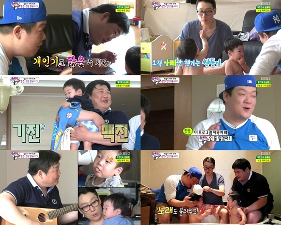 특히 김준현과 유민상은 간식을 먹는 내내 쌍둥이 앞에서 재미있는 마술(?)을 보여주는 등 친해지려고 노력했다. 과일을 다 먹은 두 사람은 이휘재와 함께 쌍둥이 목욕시키기에 도전했다.