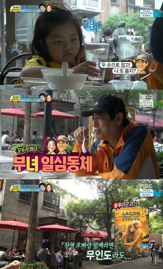 한편 이날 '아빠어디가'에서는 지난주에 이어 초저가 해외 배낭여행을 떠난 김성주-민율, 윤민수-후, 안정환-리환, 성동일-빈, 무인도로 여행을 떠난 정웅인-세윤, 류진-임찬형의 모습이 그려졌다.
