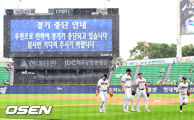 1회초, 우천으로 인하여 경기가 중단되고 있다.