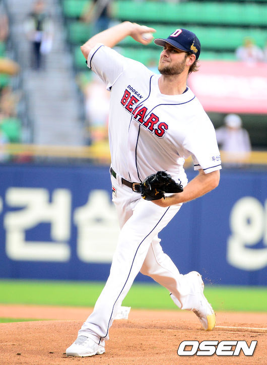 1회초, 두산 선발 크리스 볼스테드가 힘차게 공을 뿌리고 있다.
