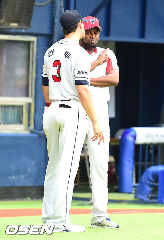 22일 오후 서울 잠실야구장에서 '2014 한국야쿠르트 세븐 프로야구' KIA 타이거즈와 두산 베어스의 경기에 앞서 두산 칸투와 KIA 어센시오가 이야기를 나누고 있다.