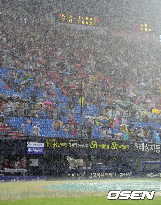 6회초, 우천으로 인하여 경기가 중단되고 있다.