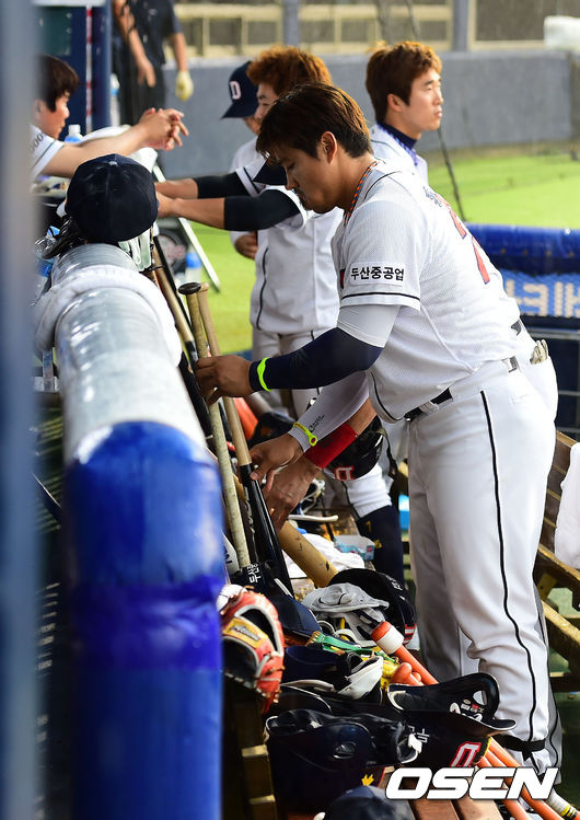 6회초, 우천으로 인하여 경기가 중단되자 두산 홍성흔이 덕아웃에서 배트를 챙기고 있다.