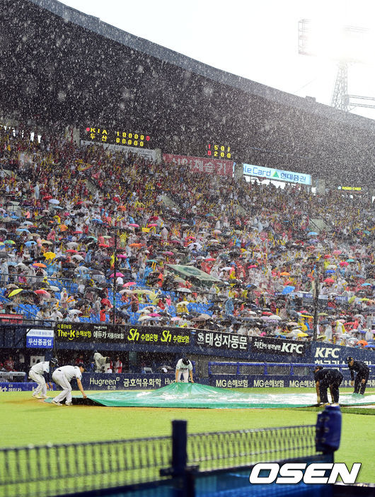 6회초, 우천으로 인하여 경기가 중단되고 있다.