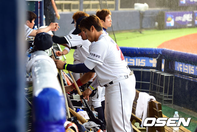 6회초, 우천으로 인하여 경기가 중단되자 두산 홍성흔과 칸투가 덕아웃에서 장비 정리를 하고 있다.