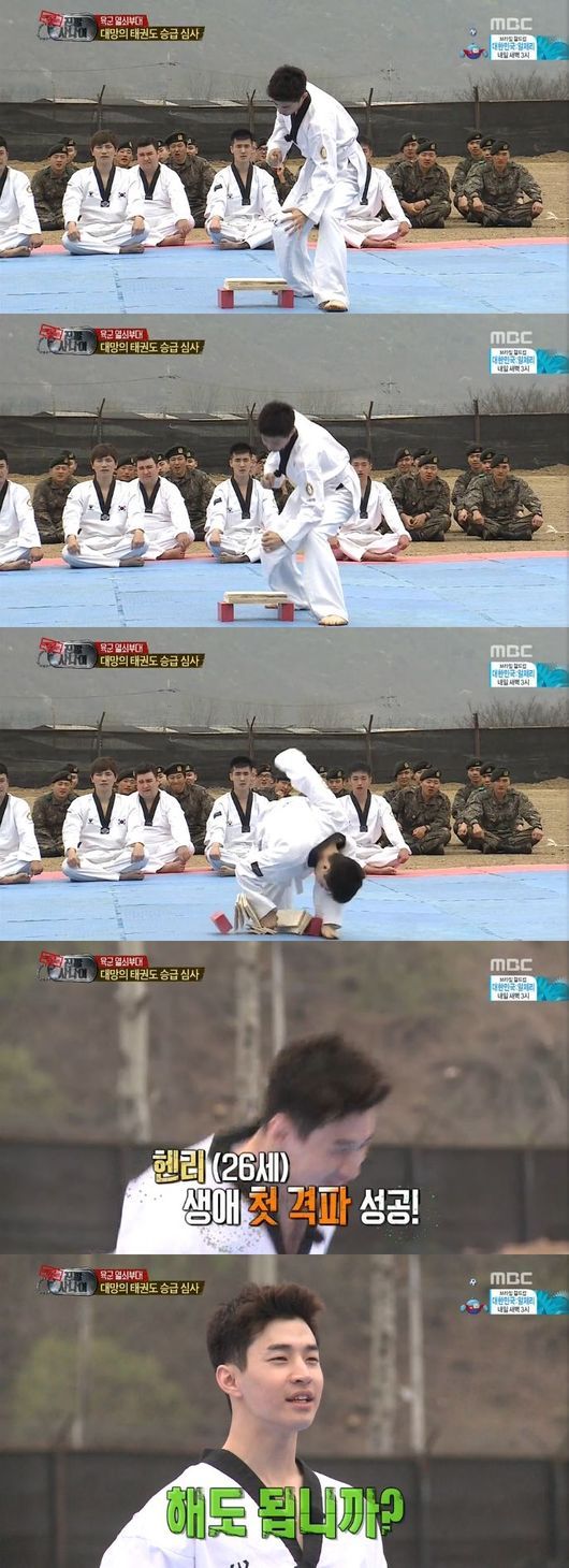 헨리가 22일 오후 방송된 MBC 예능프로그램 '일밤-진짜사나이'(이하 '진짜사나이')에서 난생 처음으로 송판 격파에 성공했다.