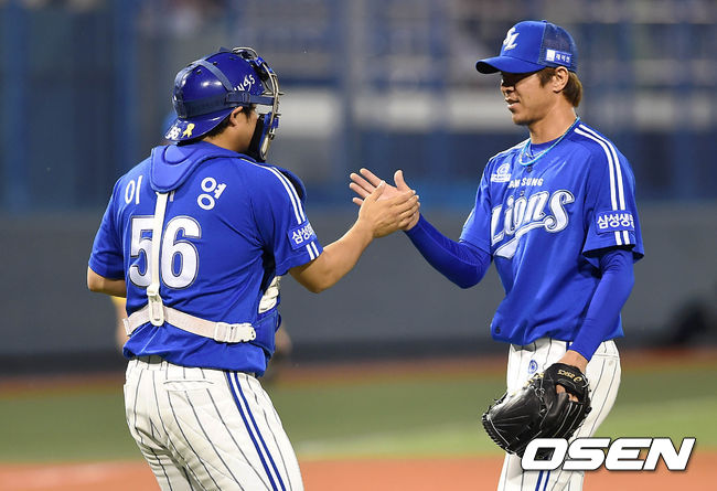 경기 종료 후 삼성 포수 이지영과 임창용이 승리의 기쁨을 나누고 있다./sunday@osen.co.kr