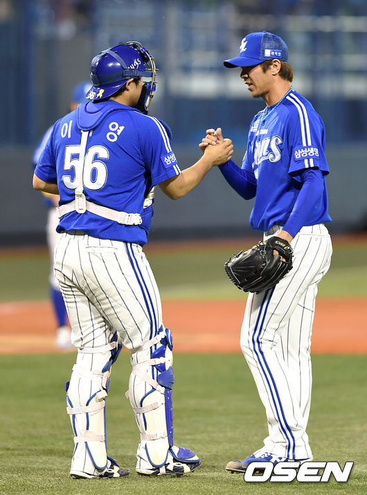 경기 종료 후 삼성 포수 이지영과 임창용이 승리의 기쁨을 나누고 있다./sunday@osen.co.kr