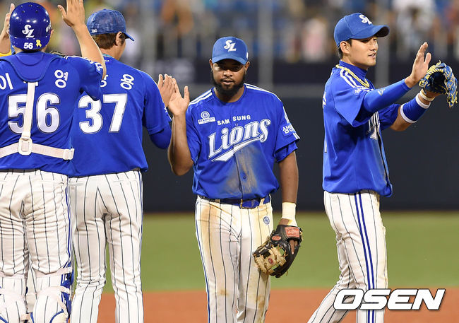 경기 종료 후 삼성 마바로가 동료들과 승리의 기쁨을 나누고 있다./sunday@osen.co.kr