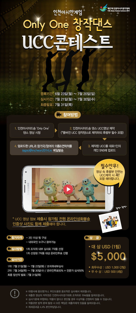 인천아시안게임 홍보대사 JYJ가 부른 온리원 안무를 바탕으로 개성 있는 창작 댄스를 응모하는 방식이며 내·외국인 구분 없이 3인 이상으로 구성된 팀이면 누구나 참여할 수 있다. 23일부터 7월 20일까지 이메일(iagoc@incheon2014.kr)로 접수하면 된다. 엄정한 심사와 온라인 투표 등을 통해 최종 수상팀을 선정한다. 대상 1팀에게는 5000달러 등 7팀에 총 9000달러의 상금이 지급된다.