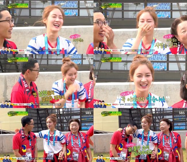 성유리는 동료들의 축하에 수줍게 미소를 지은 후, 씩씩하게 태극전사를 응원했다. 이어 성유리는 김제동에게 “곧 좋은 소식 들려주세요”라고 전하며 그의 등을 토닥거려 웃음을 자아냈다.