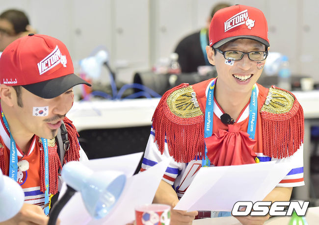 23일(이하 한국시간) 브라질 르투 알레그레 에스타디오 베이라-리오에서 2014 브라질 월드컵 조별리그 H조 대한민국과 알제리의 경기가 진행될 가운데 MBC 중계팀을 찾은 무한도전 유재석과 노홍철이 이야기를 나누고 있다.