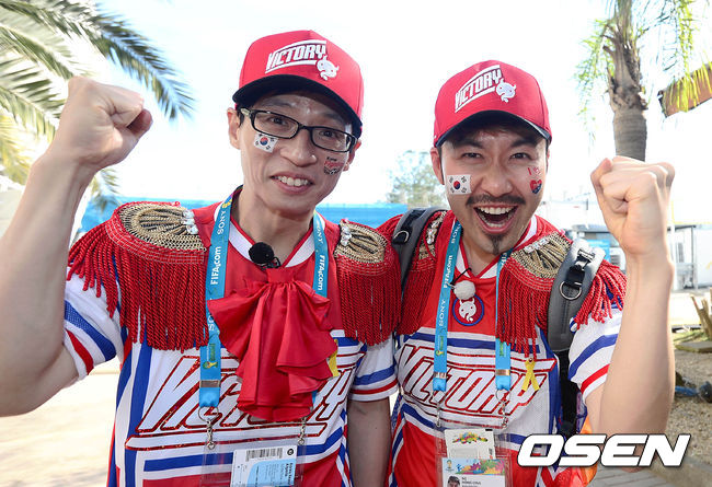 23일(이하 한국시간) 브라질 르투 알레그레 에스타디오 베이라-리오에서 2014 브라질 월드컵 조별리그 H조 대한민국과 알제리의 경기가 진행될 가운데 무한도전 유재석과 노홍철이 취재진을 향해 포즈를 취하고 있다.