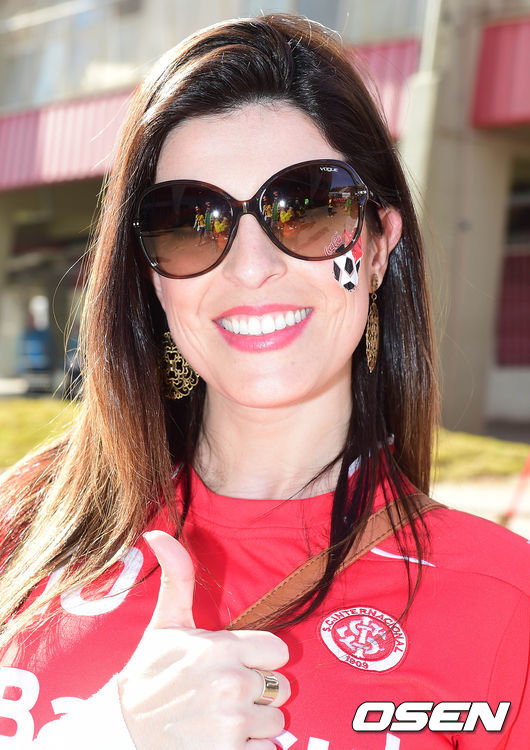 23일(이하 한국시간) 브라질 르투 알레그레 에스타디오 베이라-리오에서 2014 브라질 월드컵 조별리그 H조 대한민국과 알제리의 경기가 진행될 가운데 여성 축구팬이 취재진을 향해 포즈를 취하고 있다.
