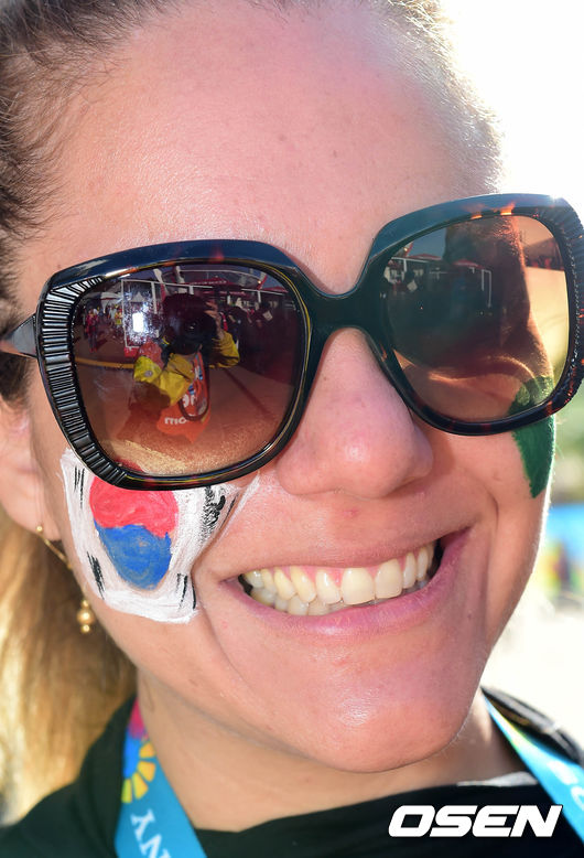 23일(이하 한국시간) 브라질 르투 알레그레 에스타디오 베이라-리오에서 2014 브라질 월드컵 조별리그 H조 대한민국과 알제리의 경기가 진행될 가운데 여성 축구팬이 취재진을 향해 포즈를 취하고 있다.