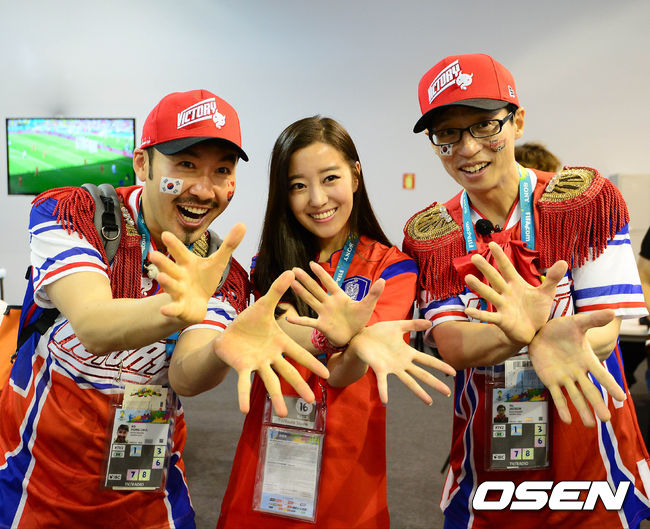 23일(이하 한국시간) 브라질 르투 알레그레 에스타디오 베이라-리오에서 2014 브라질 월드컵 조별리그 H조 대한민국과 알제리의 경기가 진행될 가운데 유재석과 노홍철이 이재은 아나운서와 프레스센터를 찾아 좋은 경기를 펼칠걸 주문하고 있다.