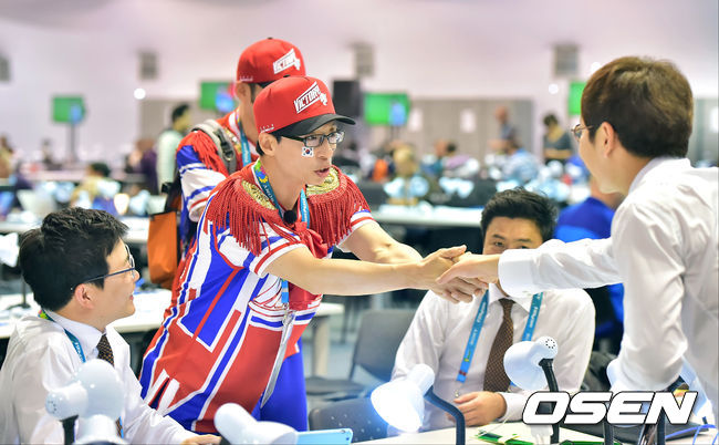 23일(이하 한국시간) 브라질 르투 알레그레 에스타디오 베이라-리오에서 2014 브라질 월드컵 조별리그 H조 대한민국과 알제리의 경기가 진행될 가운데 유재석과 노홍철이 프레스센터를 찾아 송종국과 인사를 나누고 있다.