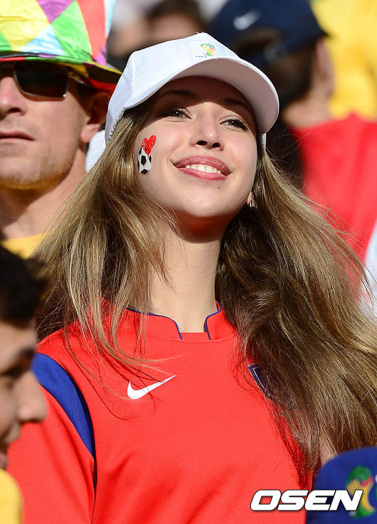 23일(이하 한국시간) 브라질 르투 알레그레 에스타디오 베이라-리오에서 2014 브라질 월드컵 조별리그 H조 대한민국과 알제리의 경기가 진행될 가운데 한국 대표팀 유니폼을 입은 여성팬이 미소를 짓고 있다.