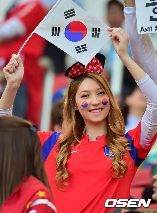 23일(이하 한국시간) 브라질 르투 알레그레 에스타디오 베이라-리오에서 2014 브라질 월드컵 조별리그 H조 대한민국과 알제리의 경기가 진행될 가운데 한 미녀 축구팬이 태극기를 흔들며 한국팀을 응원하고 있다.