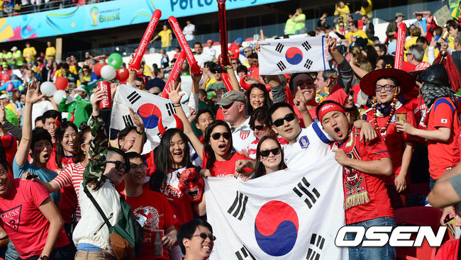 23일(이하 한국시간) 브라질 르투 알레그레 에스타디오 베이라-리오에서 2014 브라질 월드컵 조별리그 H조 대한민국과 알제리의 경기가 진행될 가운데 한국 응원단이 열띤 응원을 펼치고 있다.