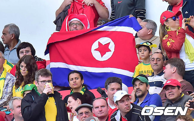 전반 외국 축구팬이 북한의 국기를 펼치고 응원하고 있다.