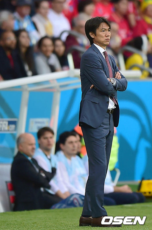 후반 한국 홍명보 감독이 경기를 바라보고 있다.
