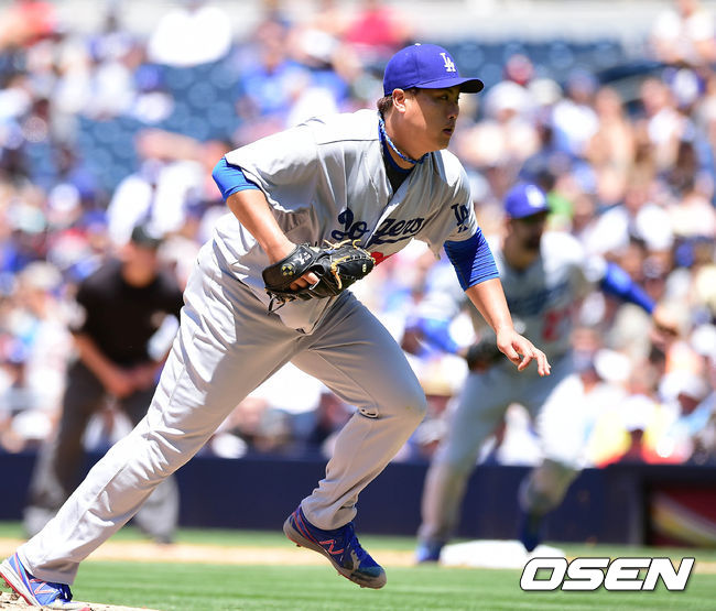 23일(이하 한국시간) 미국 캘리포니아주 샌디에이고 펫코 파크에서 열린 '2014 메이저리그' 샌디에이고 파드리스와 LA 다저스의 경기, 4회말 무사 1루 류현진이 카브레라의 번트타구를 수비하고 있다.