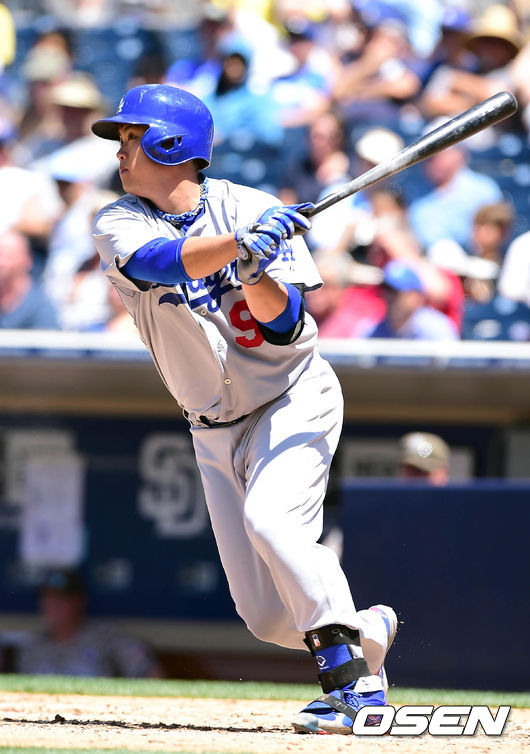 23일(이하 한국시간) 미국 캘리포니아주 샌디에이고 펫코 파크에서 열린 '2014 메이저리그' 샌디에이고 파드리스와 LA 다저스의 경기, 5회초 선두타자로 나선 류현진이 좌전 안타를 치고 있다.