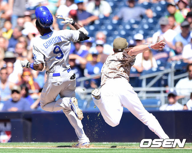 7회초 2사 다저스 디 고든이 기습번트로 1루까지 진루하려다 아웃당하고 있다./youngrae@osen.co.kr