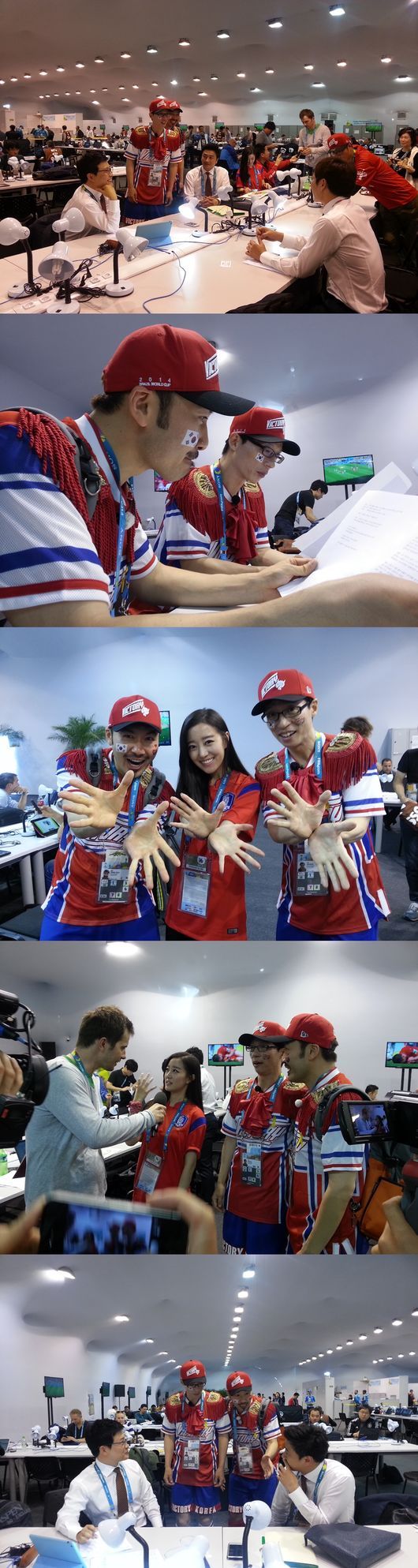 공개된 사진 속 유재석과 노홍철은 MBC 중계3인방 김성주, 안정환, 송종국을 방문해 인사를 나누고 있다. 뿐만 아니라 외국 취재진 앞에서 이재은 아나운서와 함께 인터뷰를 하고 있는 모습이 보이기도 해 눈길을 끈다.