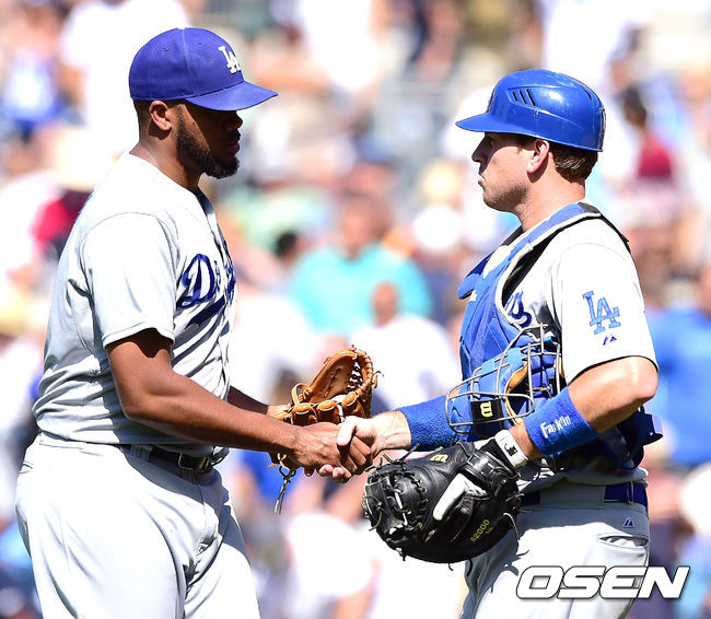 승리를 거둔 다저스 젠슨과 A.J 엘리스가 악수를 나누고 있다./youngrae@osen.co.kr