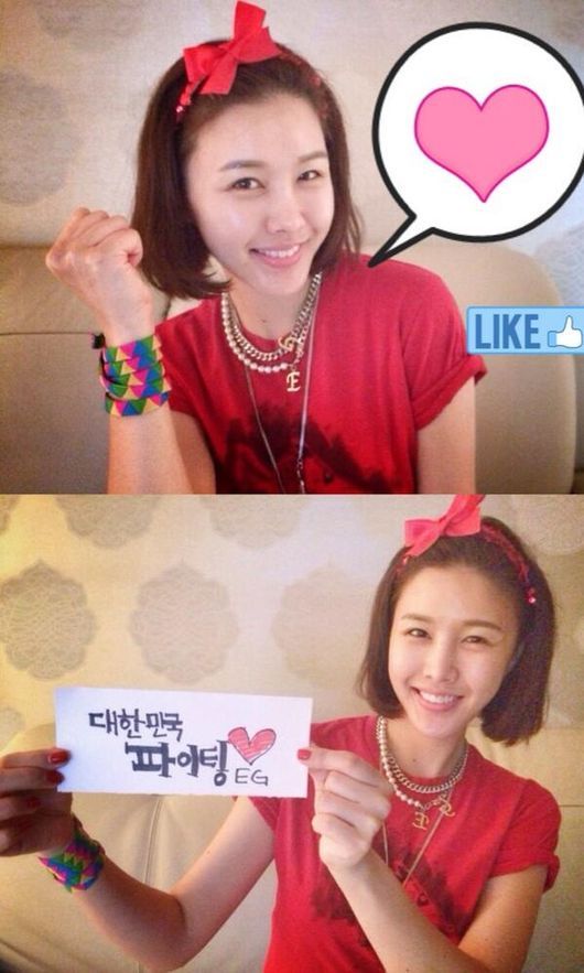 사진 속 박은지는 메이크업을 거의 하지 않은 수수한 모습이다. 붉은 티셔츠를 입고 머리띠를 한 채 ‘대한민국 파이팅’이라는 글귀가 쓰여진 작은 플래카드를 들고 있다. 특히 말풍선 안에 큰 하트를 그려 넣은 것이 눈에 띈다.