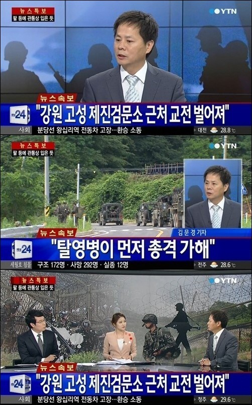 GOP 총기난사 후 탈영한 임모 병장이 22일 오후 2시 30분께 강원도 고성군 명파리 명파초등학교 인근 제진검문소에서 군 당국과 교전중이다. 22일 오후 2시 13분경 탈영병 임모 병장이 부대와 10km 정도 떨어진 강원 고성군 명파초등학교 근처 제진검문소에서 군과 교전을 벌였다. 오후 8시경 군 당국은 임 병장에게 투항을 권유하며 대치하고 있으나, 임 병장은 투항을 계속 거부하고 있다.