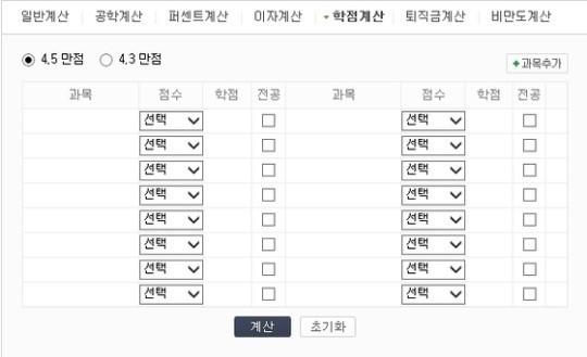 학점계산기는 간단한 입력으로 전체 학점을 계산할 수 있는 프로그램으로 과목별 점수와 학점을 입력하기만 하면 곧바로 평균 평점을 계산할 수 있다. 학점계산기에 있는 4.5만점과 4.3만점 선택사항 중 자신의 대학에 맞는 점수를 선택한 후 과목별 학점을 입력하면 평균값이 계산 돼 나온다.