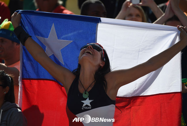 칠레 여성팬이 국기를 들고 응원을 하고 있다.