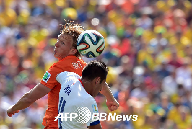 경기 전반 네덜란드 디르크 카윗과 칠레 마우리시오 이슬라와 헤딩 경합을 벌이고 있다.