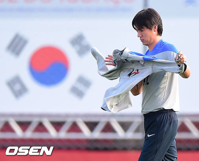 24일 오전(이하 한국시간) 홍명보 감독이 이끄는 축구국가대표팀이 브라질 이구아수의 페드로 바소경기장에서 훈련을 가졌다. 홍명보 감독이 유니폼을 벗고 있다.