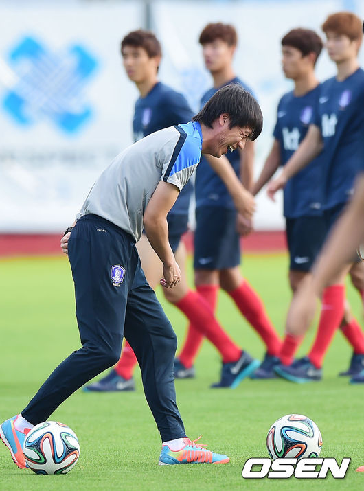 24일 오전(이하 한국시간) 홍명보 감독이 이끄는 축구국가대표팀이 브라질 이구아수의 페드로 바소경기장에서 훈련을 가졌다. 홍명보 감독이 선수들과 함께 볼 게임을 하며 환하게 웃고 있다.