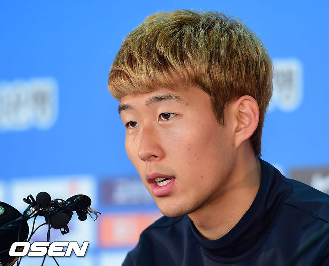 24일 오전(이하 한국시간) 홍명보 감독이 이끄는 축구국가대표팀이 브라질 이구아수의 페드로 바소경기장에서 훈련을 가졌다. 훈련 전 손흥민이 기자회견을 하고 있다.