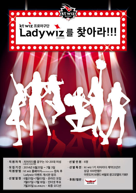 kt wiz 야구단이 2015시즌 치어리더 공개 오디션인 '레이디즈(Ladywiz)를 찾아라(가칭)'를 실시한다.