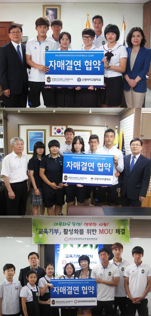 인천은 지난 13일 신명여자고등학교, 16일 부평서여중학교, 그리고 23일 경인교대 부설초등학교와 연고 의식 강화 및 홈경기 흥행을 위한 자매결연 협약식을 각각 체결했다고 밝혔다. 협약식에는 각 학교 교장과 인천 유나이티드 조동암 대표이사, 선수단이 참석했다.