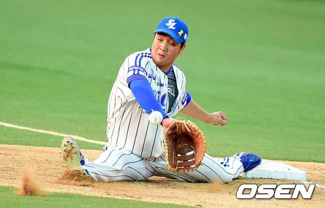 2회초 무사 1루에서 삼성 채태인이 넥센 강정호의 3루땅볼에 박석민의 송구를 잡으려 안간힘을 쓰고 있다. 송구가 뒤로 빠지며 실점 허용.